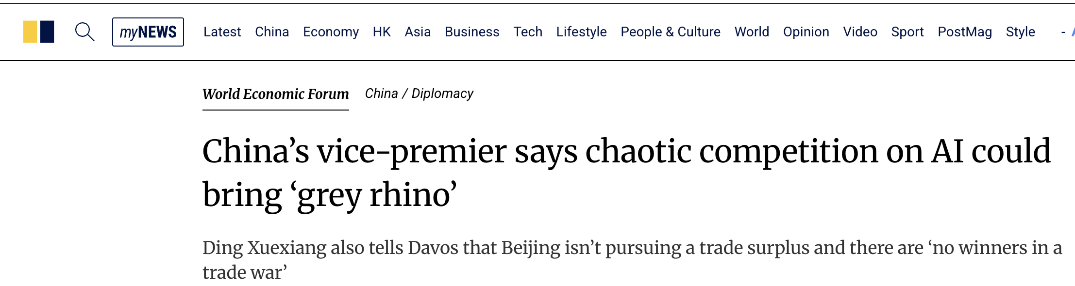 South China Morning Post: China’s vice-premier says chaotic competition on AI could bring ‘grey rhino’